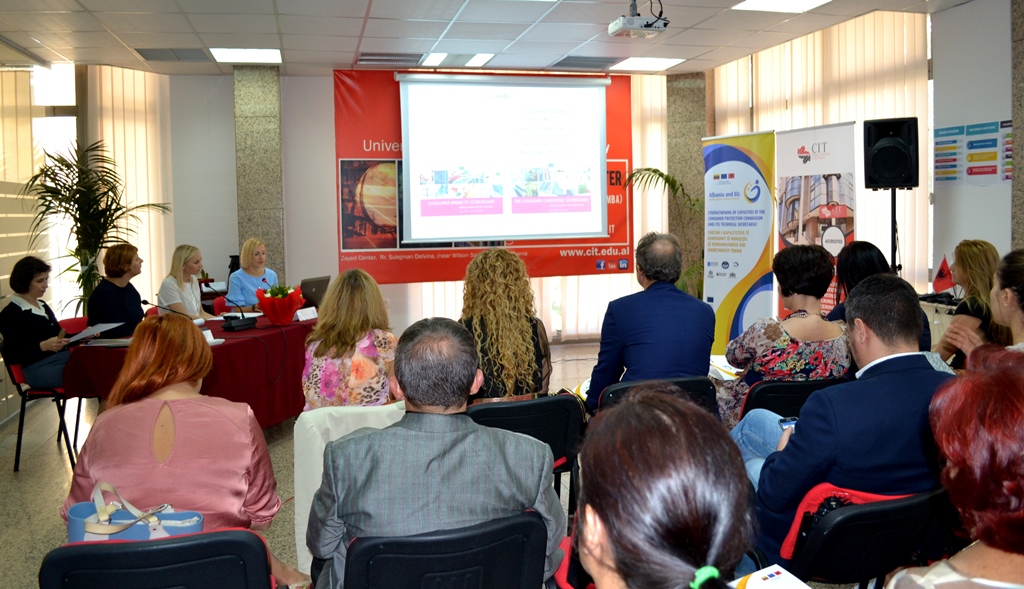 Konferencë mbi rritjen e sensibilizimit për të drejtat e konsumatorëve: “Fuqizimi i konsumatorëve për marrjen e vendimeve të mirë informuara e organizuar në kuadër të Projektit të Binjakëzimit të BE-së “Fuqizimi i kapaciteteve të Komisionit për Mbrojtjen e Konsumatorit dhe Sekretariatit të tij Teknik” zhvilluar ne ambientet e Institutin Kanadez të Teknologjisë, Tirane.
