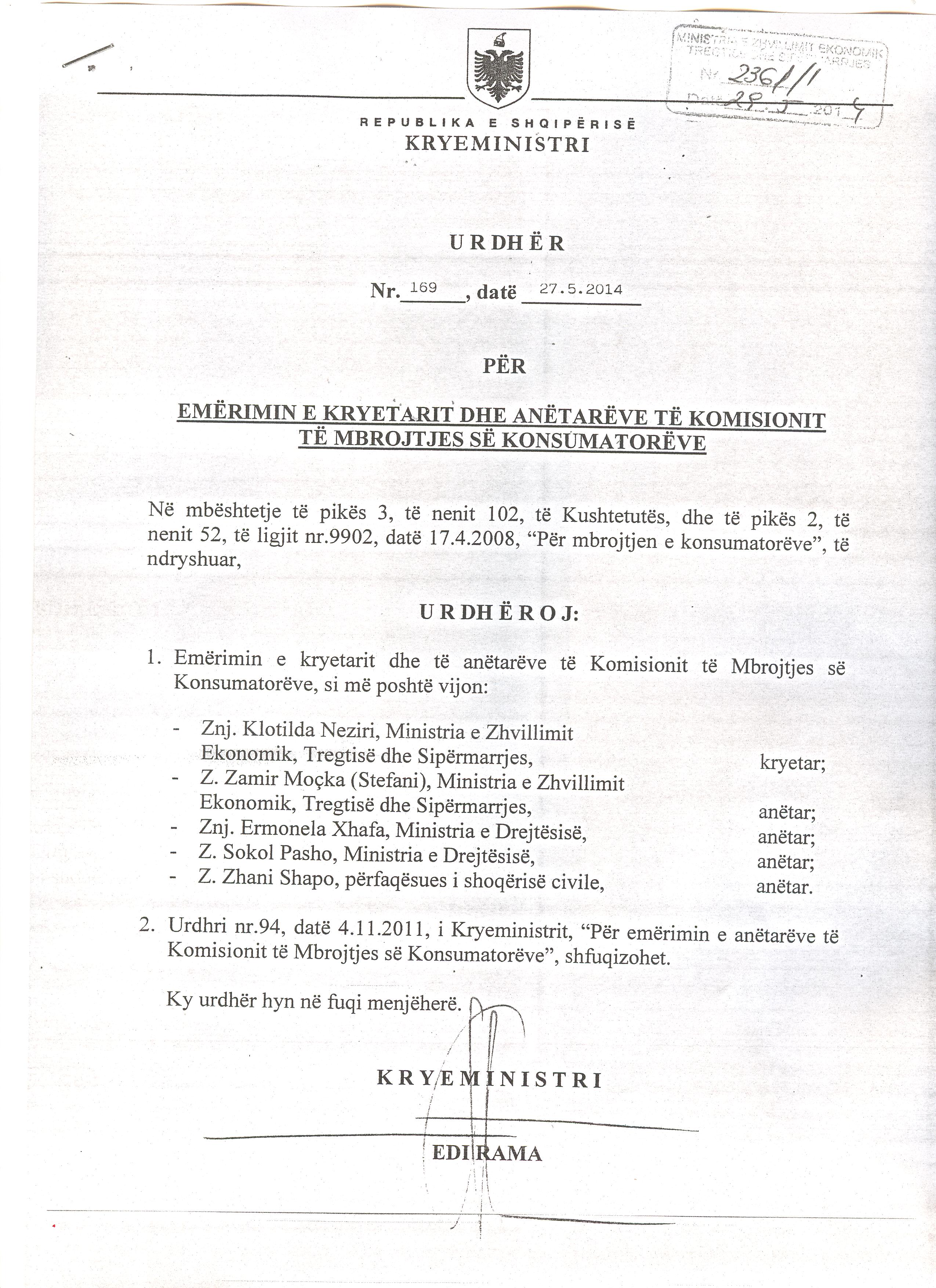 - Urdhër i Kryeministrit nr. 169, date 27.5.2014 “Për emërimin e kryetarit dhe te anëtarëve te Komisionit te Mbrojtjes se Konsumatorëve”;.