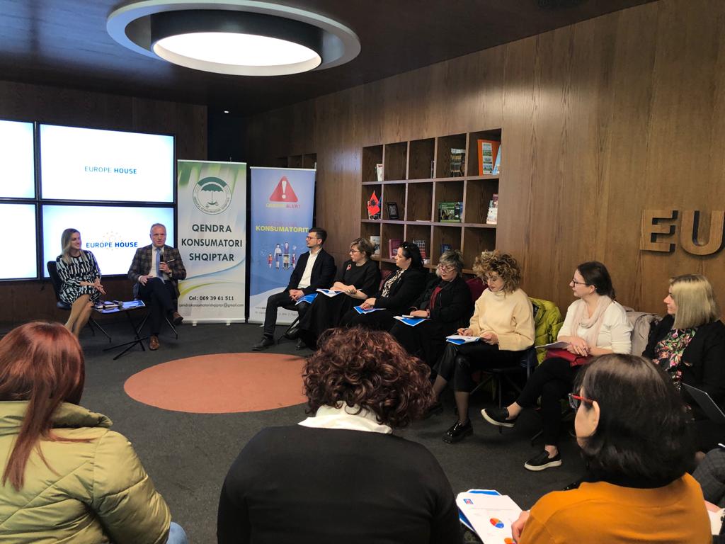 “Në datë 15 mars 2022, në ambientet e “Europa House”, me rastin e 15 Marsit Ditës Ndërkombëtare të Konsumatorit, u zhvillua një takim i përbashkët ndërgjegjësues, me përfaqësues të shoqatave të mbrojtjes së konsumatorëve, dhe të shoqërisë civile të fokusuar në mbrojtjen e të drejtave të konsumatorëve: Qendra e Konsumatori Shqiptar; Qendra Alert; Konsumatori në fokus; Qendra Peshëmatje çmime; Instituti për Zhvillim dhe Iniciativa Qytetare; Lëvizja Evropiane Shqiptare, Shoqata Mikrofinanciare Shqiptare, si dhe me përfaqësues të institucioneve shtetërore: Ministria e Financave dhe Ekonomisë, Autoriteti Kombëtar i Ushqimit; Inspektorati Shtetëror i Mbikëqyrjes së Tregut; Agjencia e Mbrojtjes së Konsumatorëve/Bashkia Tiranë, etj. Gjithashtu, në takim mori pjesë dhe përfaqësuesja e Zyrës së Delegacionit të KE në Tiranë.